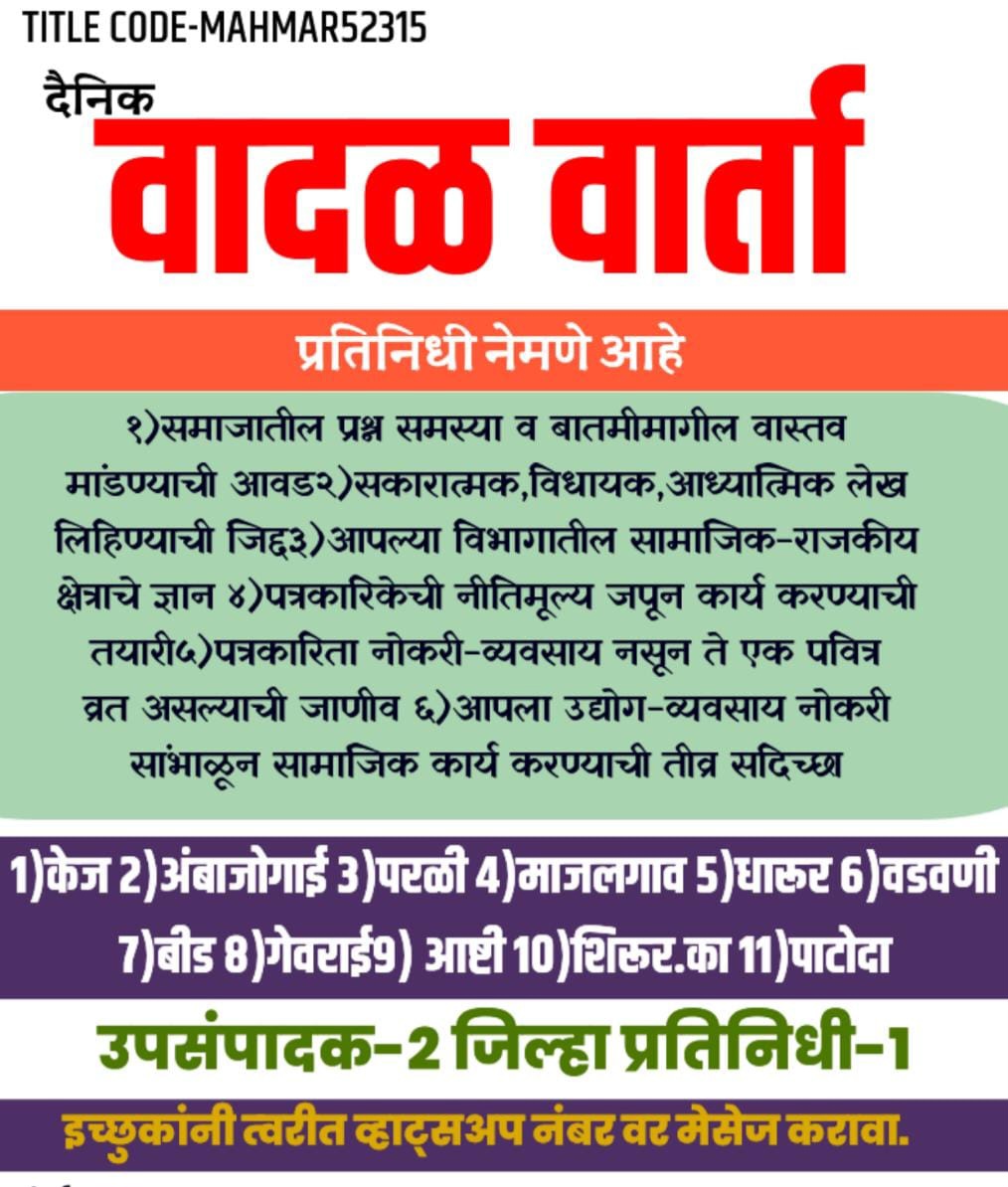 नमस्कार, वादळ वार्ता परिवारामध्ये आपले स्वागत. वादळ वार्ता च्या माध्यमातून सर्व वाचकांना विश्वसनीय व तत्पर बातम्या देण्याचा आमचा प्रयत्न आहे. प्रत्येक मताशी संपादक सहमत असेलच असे नाही. आपणही आपल्या परिसरातील बातम्यांसाठी व जाहिरातीसाठी 9422660077 या नंबरवर व्हाट्सएप तसेच कॉल करून संपर्क करू शकता......धन्यवाद....!