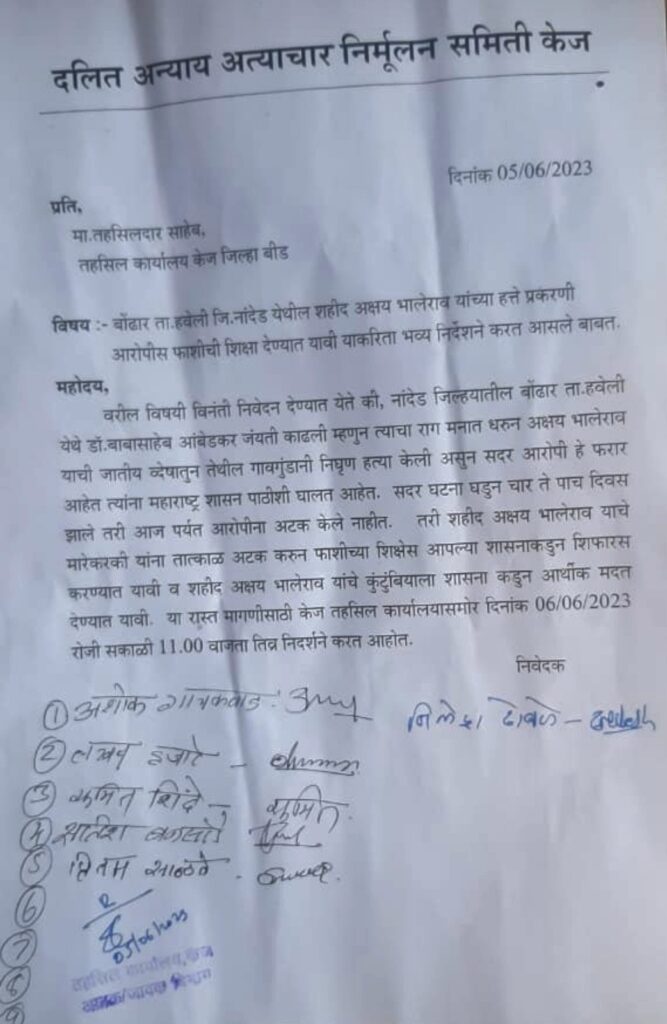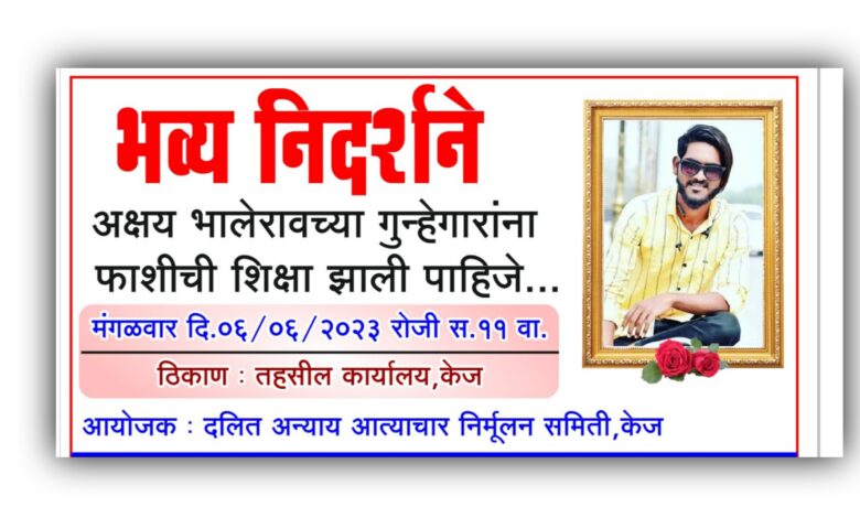 त्याच अनुषंगाने केज येथील दलित आन्याय आत्याचार निर्मुलन समीतीच्या वतीने ” अक्षय भालेरावच्या मारेकर्यांना फाशी द्यावी ” यासाठी केज तहसिल समोर तीव्र निदर्शनाचे आयोजन दि.०६ जुन रोजी सकाळी ११ वाजता केले आहे. सदरील निदर्शनास केज तालुक्यातील भिम सैनिकांनी जास्तीच्या संख्येने उपास्थित रहावे असे आवाहन समीतीचे अशोक गायकवाड , लखन हजारे , सुमित शिंदे , सतीश बनसोडे , प्रितम साळवे , निलेश ढोबळे आदि पदाधिकारी यांच्या वतीने करण्यात आले आहे.
