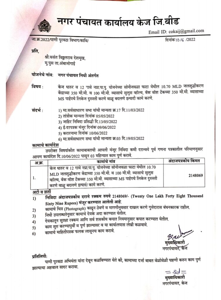 त्याचा हेतु म्हणजे घरगुती वापरासाठी पाणी रंगहीन, वासहीन, चांगल्या चवीचे आणि आरोग्यदृष्ट्या सुरक्षित असले पाहिजे हाच होय परंतु मागील दिड वर्षापासुन हा जलशुद्धी प्रकल्प आजारी पडला असल्यामुळे केज नगर पंचायतीने केज धारुरसह १२ गावाना शुद्ध पाणीपुरवठा करणाऱ्या सोनीजवळा फाटा येथील १०.७० MLD जलशुद्धीकरण केंद्राच्या ३५० मी.मी. व १०० मी.मी. व्यासाचे सुलुस व्हॉल्व, बॅक वॉश टँकच्या ३५० मी.मी. व्यासाच्या MS पाईपचे लिकेज दुरुस्ती करून वाळू बदलण्यासाठी सदरील प्रकल्पावर तब्बल २१ लक्ष ४८ हजार रुपये खर्च केले.