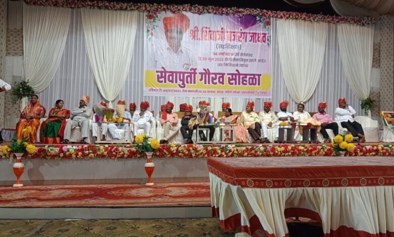 या कार्यक्रमाचे सत्कारमूर्ती शिवाजी जाधव पत्नी मंजुषा जाधव यांचा भव्य दिव्य सत्कार विश्वजीत जाधव व मित्रपरिवार कडून करण्यात आला. या सत्कार सोहळ्यात वसंतराव कातळे, कमलताई लोमटे, देशी गायकवाड, सोमनाथ बोयसे, भुसणीकर सर, यांनी मनोगत व्यक्त केले. सत्कारास उत्तर देताना शिवाजी जाधव यांनी सेवा काळातील जुन्या आठवणीला उजाळा दिला. कार्यक्रमाचे सूत्रसंचालन लोंढे सर यांनी केले तर आभार प्रदर्शन गोविंद सूर्यवंशी यांनी केले शिवाजी जाधव यांचा सत्कार करण्यासाठी आपीष्टांची लाईन लागली होती, कार्यक्रमास नातेवाईक, क्षेत्रातील अधिकारी, गावकरी मोठ्या संख्येने उपस्थित होते. सुरुची भोजनाने कार्यक्रमाची सांगता आली कार्यक्रम यशस्वी करण्यासाठी विश्वजीत जाधव व मित्रमंडळीने परिश्रम घेतले.