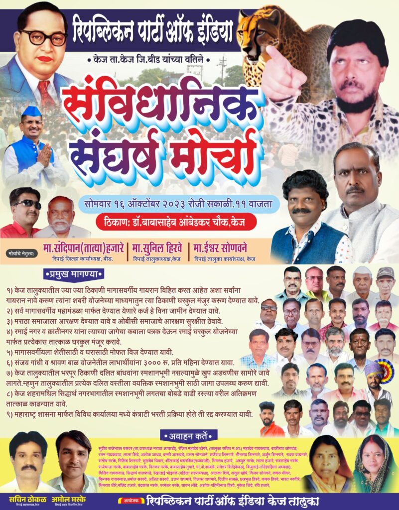 या बाबत सविस्तर वृत्त असे कि केज तालुक्यातील दलीत , शेतकरी,कष्टकरी , गायरानधारक, मजुर, आदिचे विविध प्रश्न हाती घेऊन रिपब्लिकन पार्टी ऑफ इंडिया (आ.) चे बीड जिल्ह्याचे कार्याध्यक्ष संदिपान तात्या हजारे यांच्या मार्गदर्शनाखाली तसेच तालुका अध्यक्ष सुनील हिरवे यांच्या नेतृत्वाखाली केज येथे दि.१६ अक्टोंबर रोजी सकाळी महामोर्चा केज तहसिल कार्यालयावर येऊन धडकणार आहे. सदरील मोर्चातील मागण्या